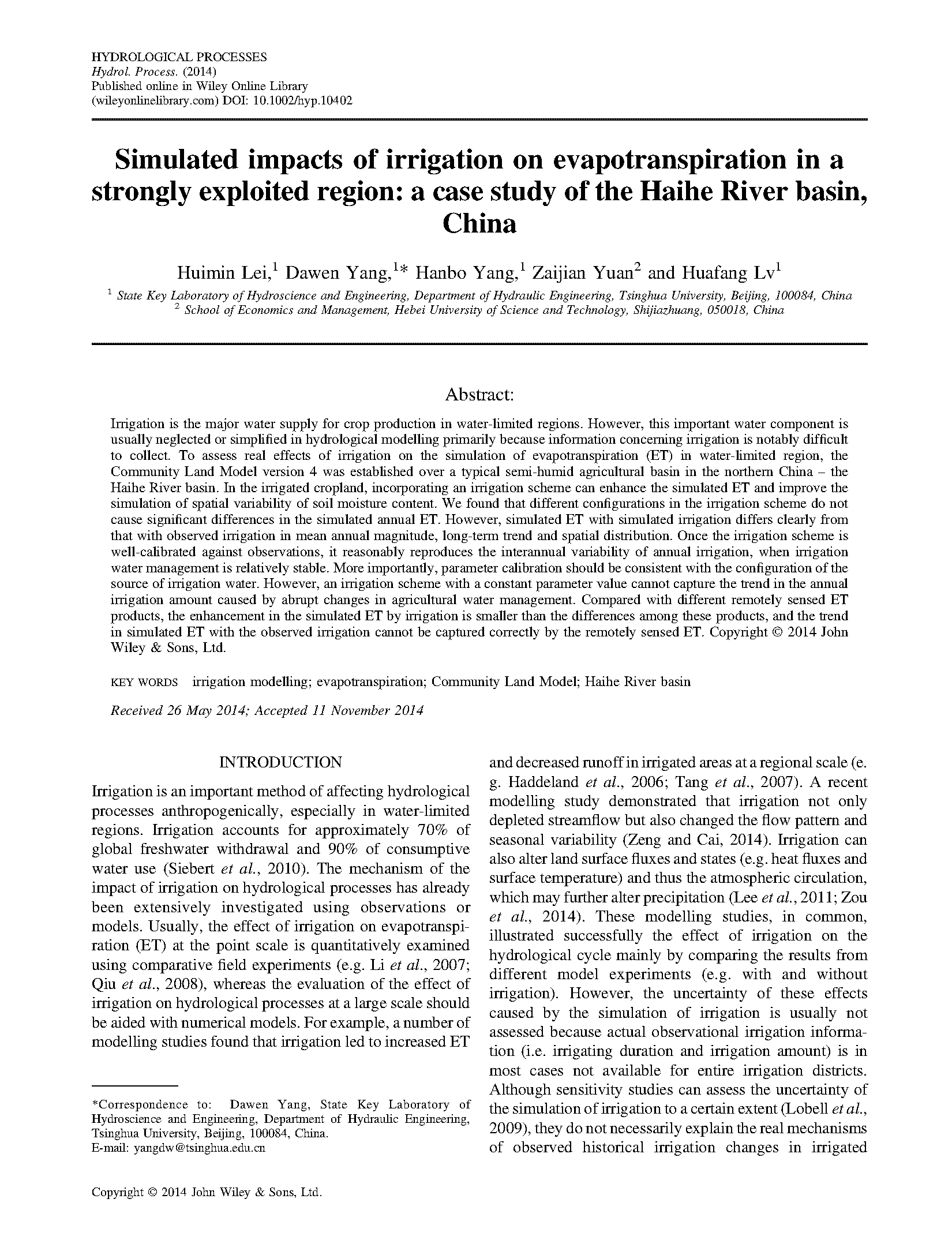 [73] Huimin Lei, Dawen Yang, Hanbo Yang, Zaijian Yuan and Huafang Lv (2014), Simulated impacts of irrigation on evapotranspiration in a strongly exploited region: a case study of the Haihe River basin, China. Hydrological Processes. DOI: 10.1002/hyp.10402
